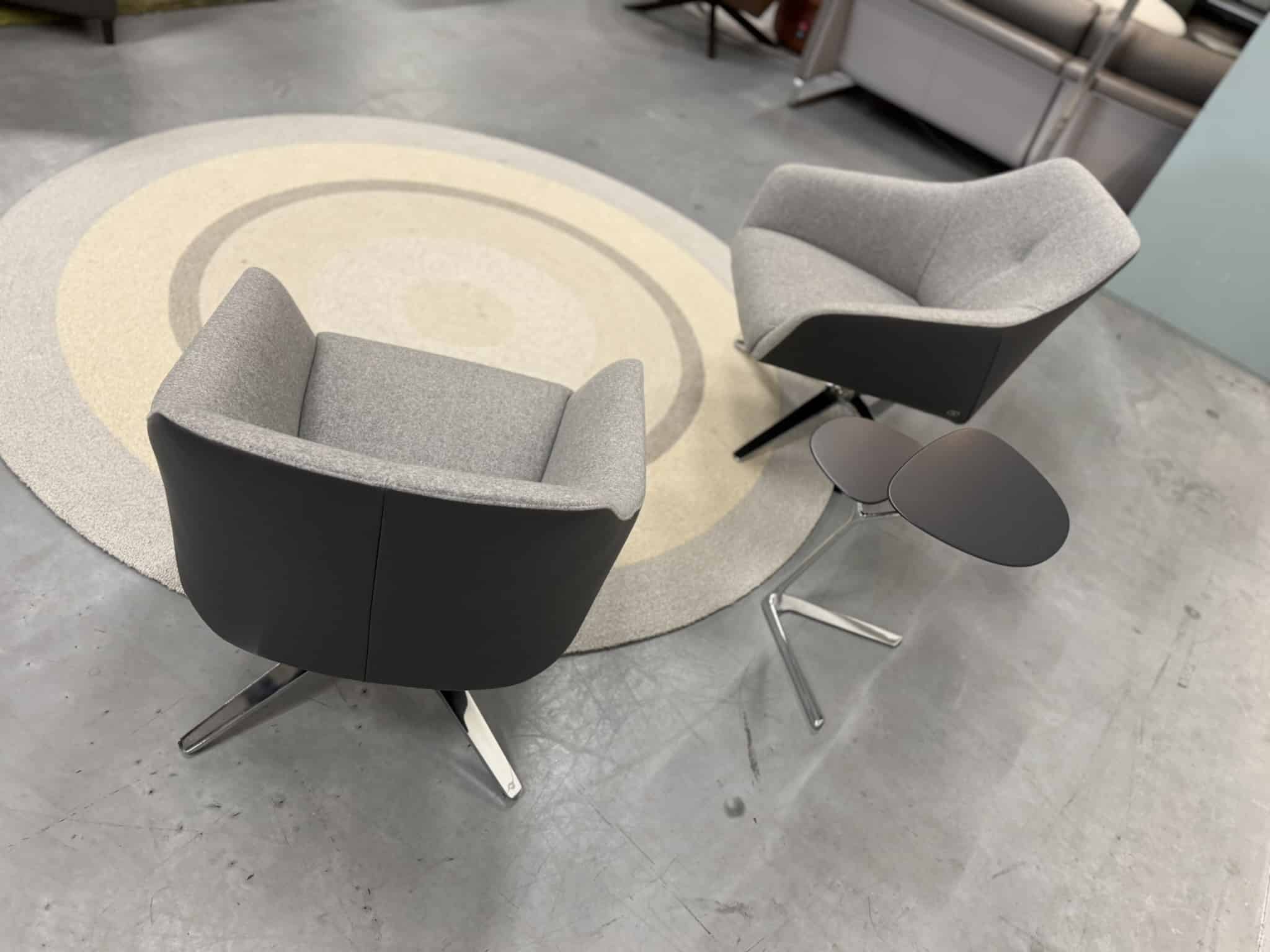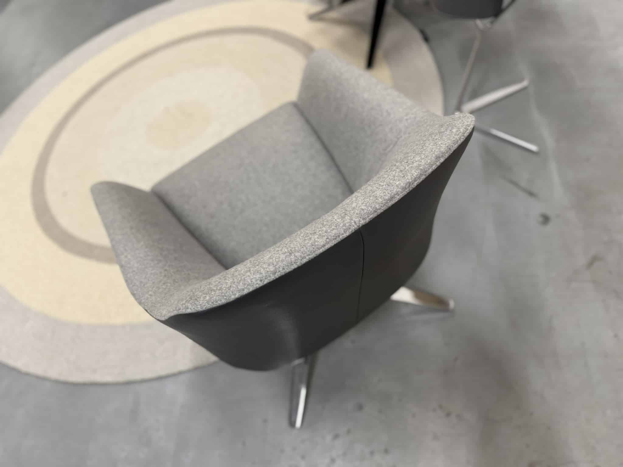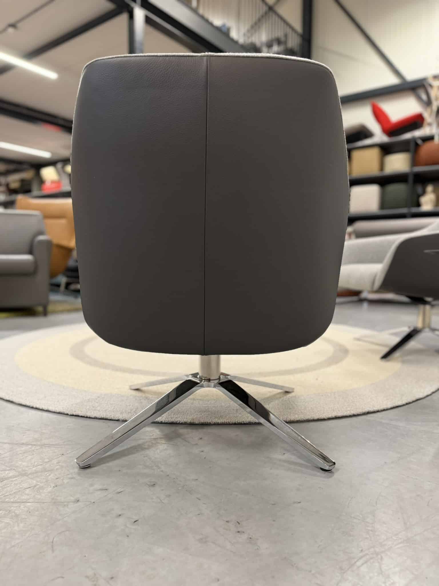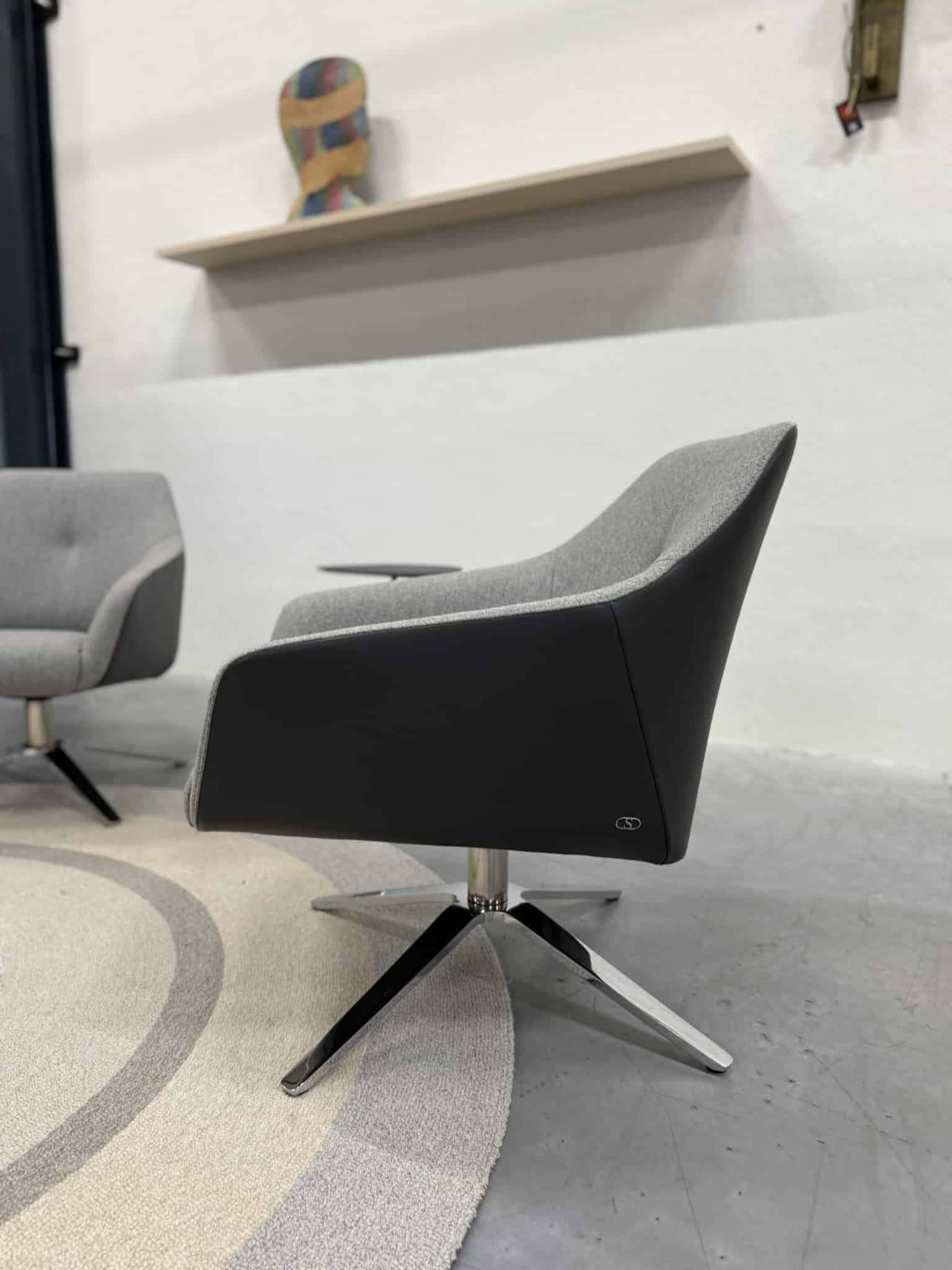 Set van 2 nieuwe De Sede 278/01 draaifauteuils, uitgevoerd in luxe Leder Living 2802 Umbra met een binnenzijde van zachte Craft 905 grijze stof. Het hoogglans verchroomde onderstel geeft deze fauteuils een verfijnde, moderne uitstraling die naadloos aansluit bij stijlvolle en eigentijdse interieurs.