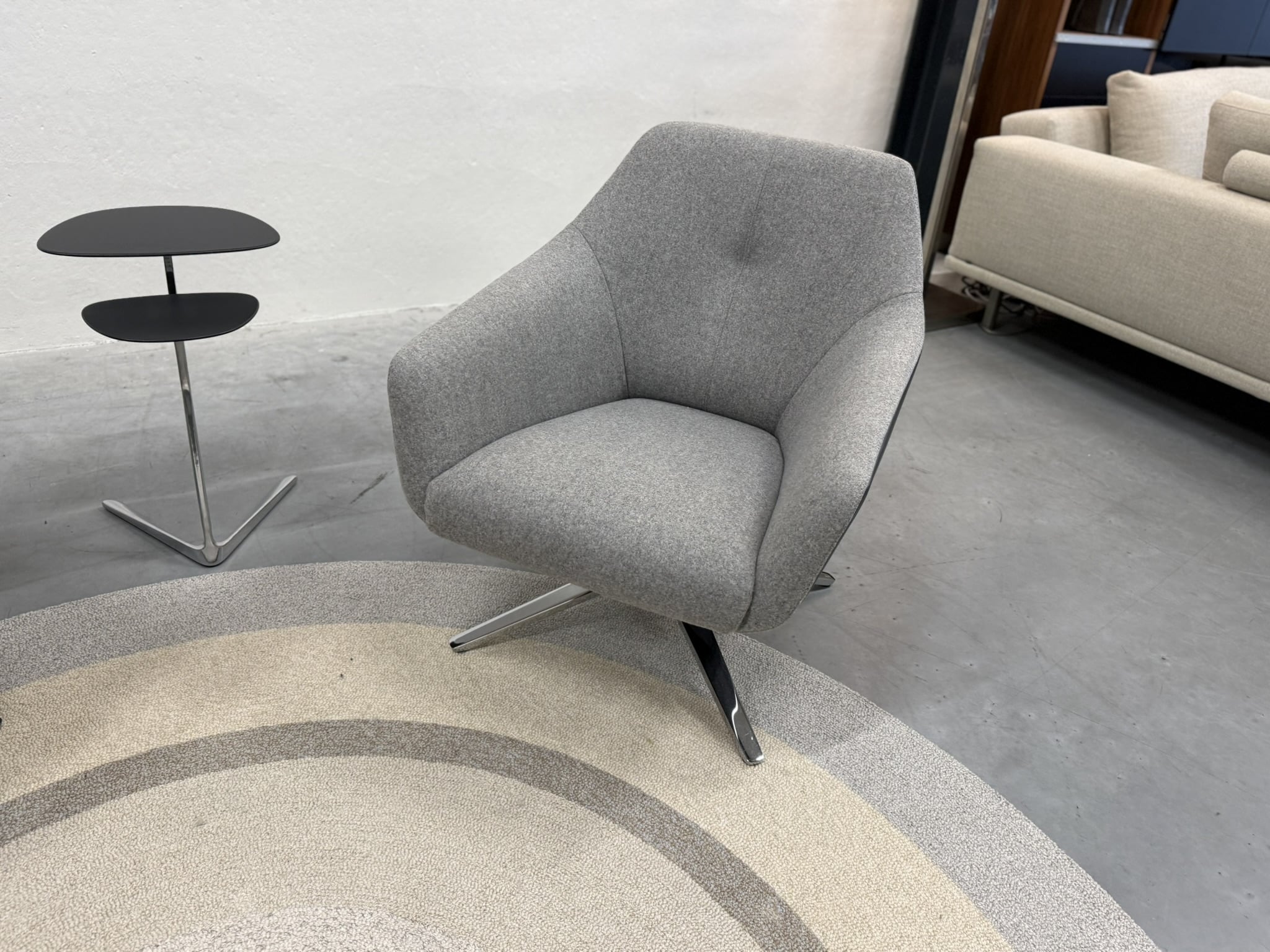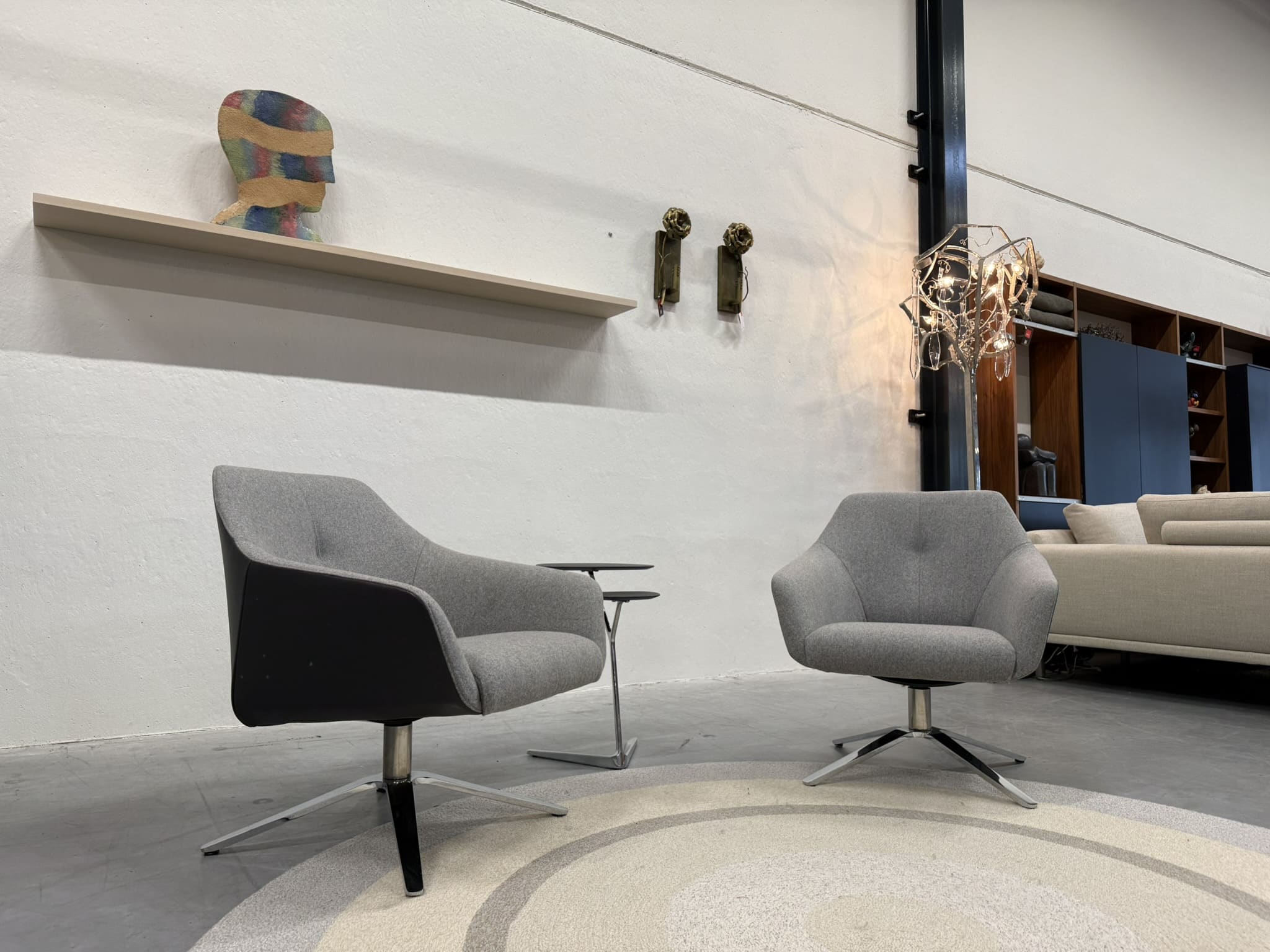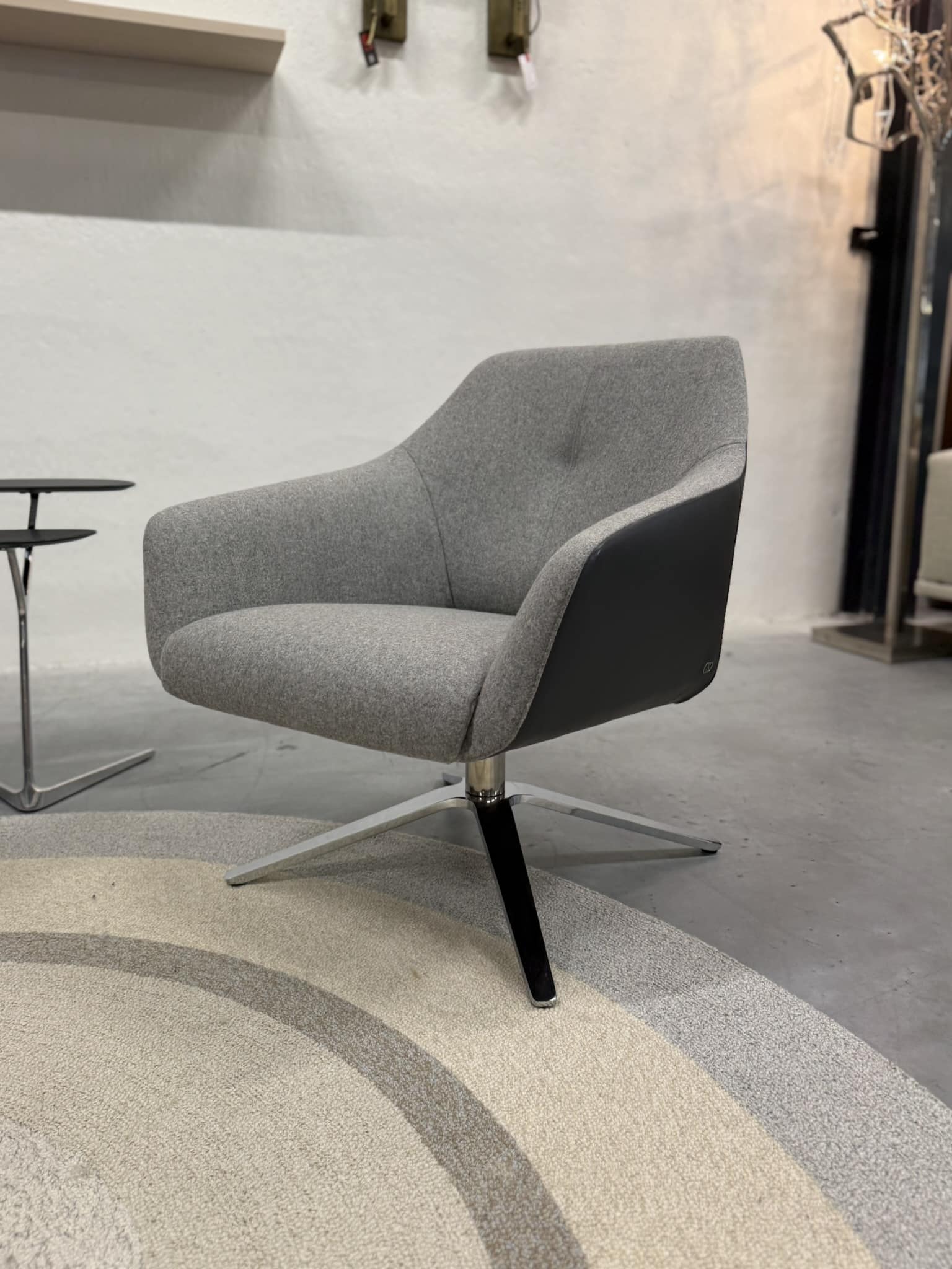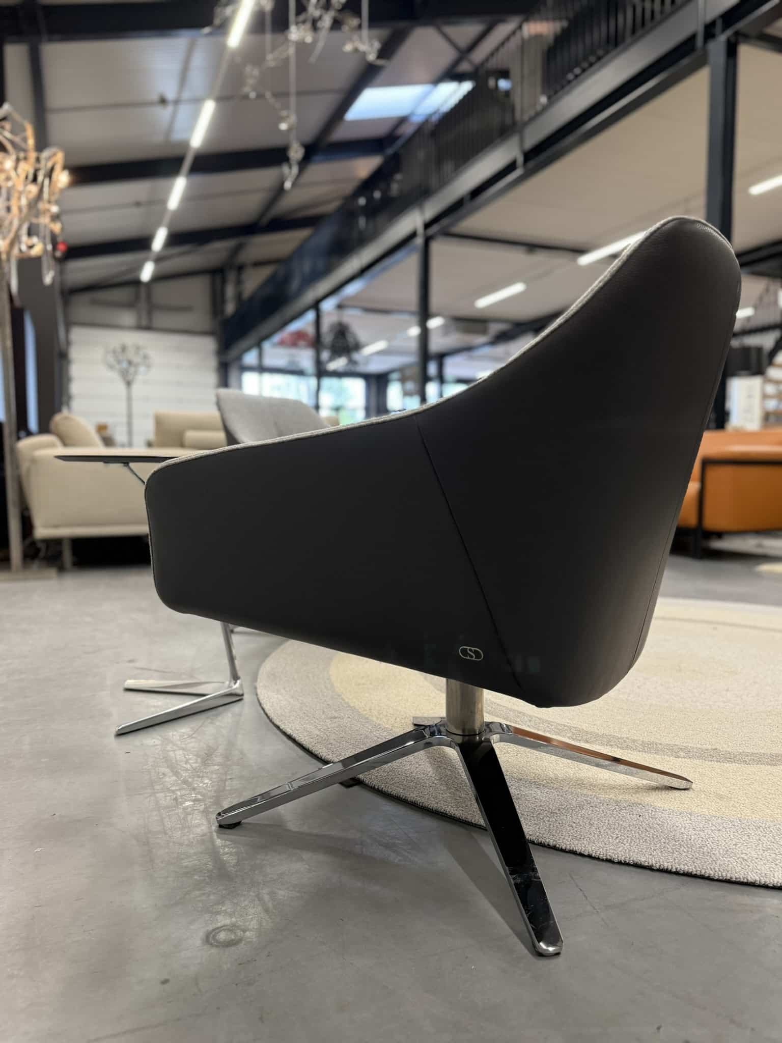 Set van 2 nieuwe De Sede 278/01 draaifauteuils, uitgevoerd in luxe Leder Living 2802 Umbra met een binnenzijde van zachte Craft 905 grijze stof. Het hoogglans verchroomde onderstel geeft deze fauteuils een verfijnde, moderne uitstraling die naadloos aansluit bij stijlvolle en eigentijdse interieurs.