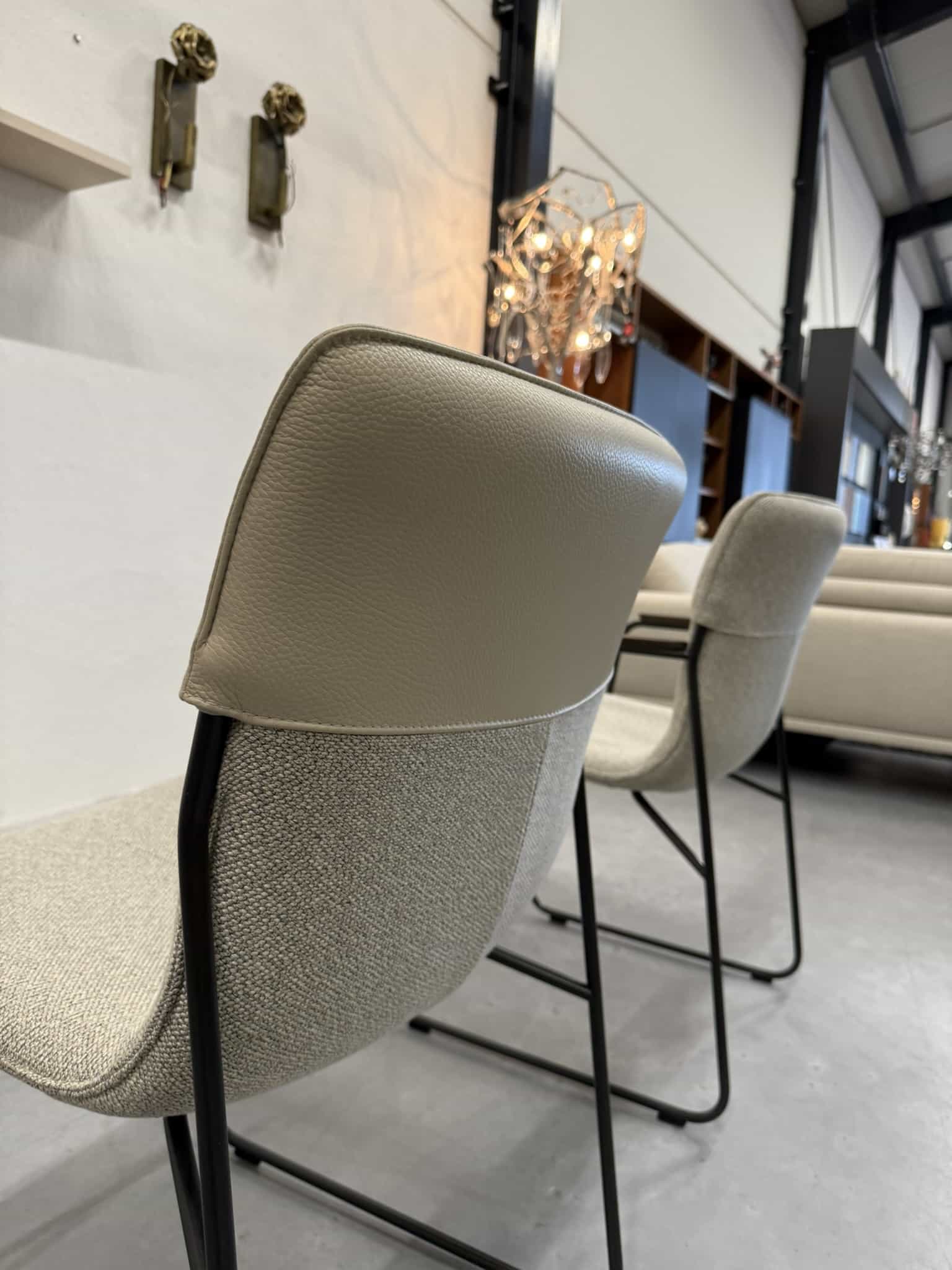 Twee nieuwe Leolux Ditte eetkamerstoelen, uitgevoerd in Loft 200 stof in de warme kleur Langsat en voorzien van een epoxy nuit silk onderstel.
