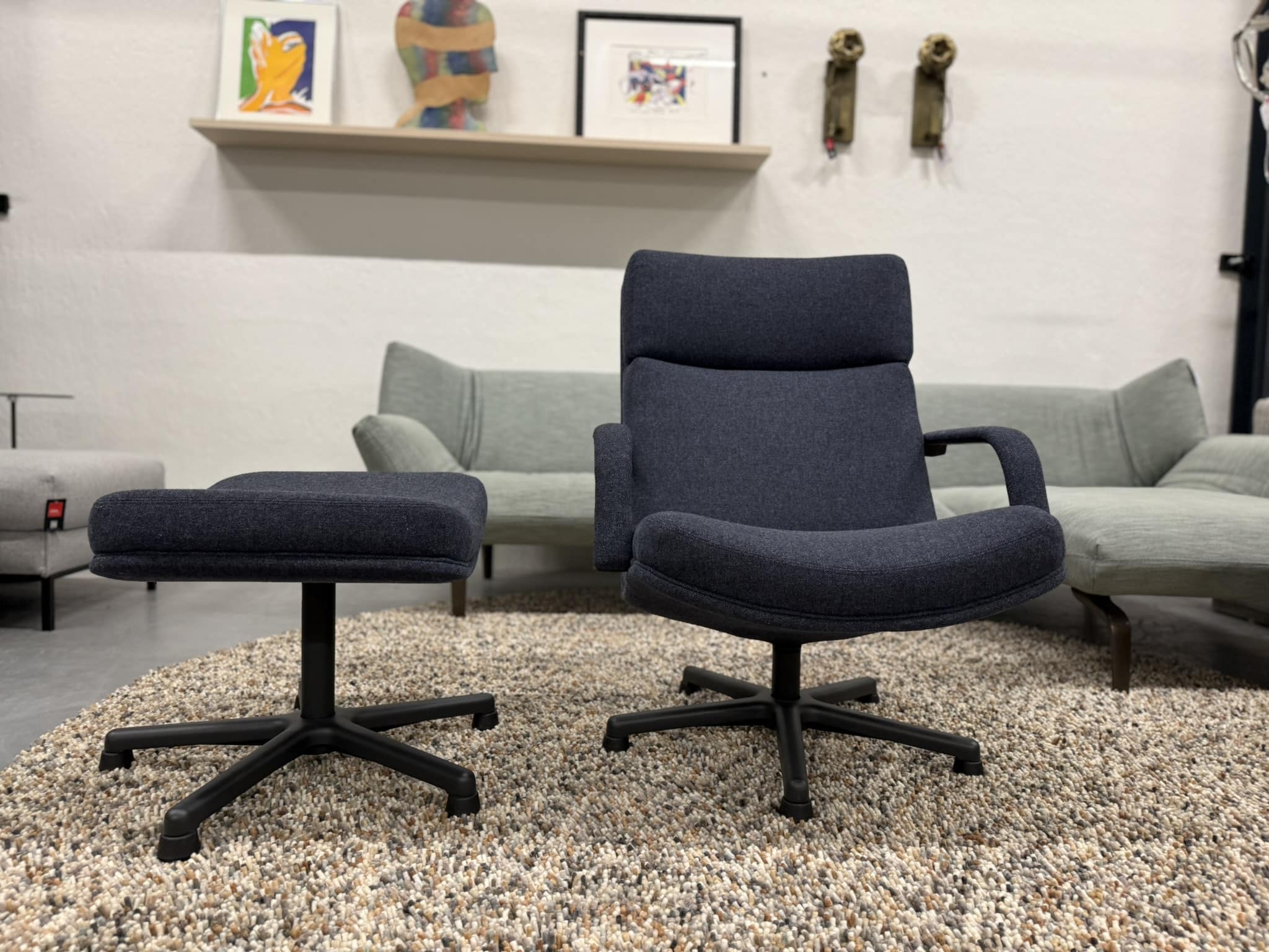 Nieuw artifort f141 fauteuil met poef uitgevoerd in blauwe wolstof. Nieuwprijs €3322 afm 68xd86xh86 zh42cm