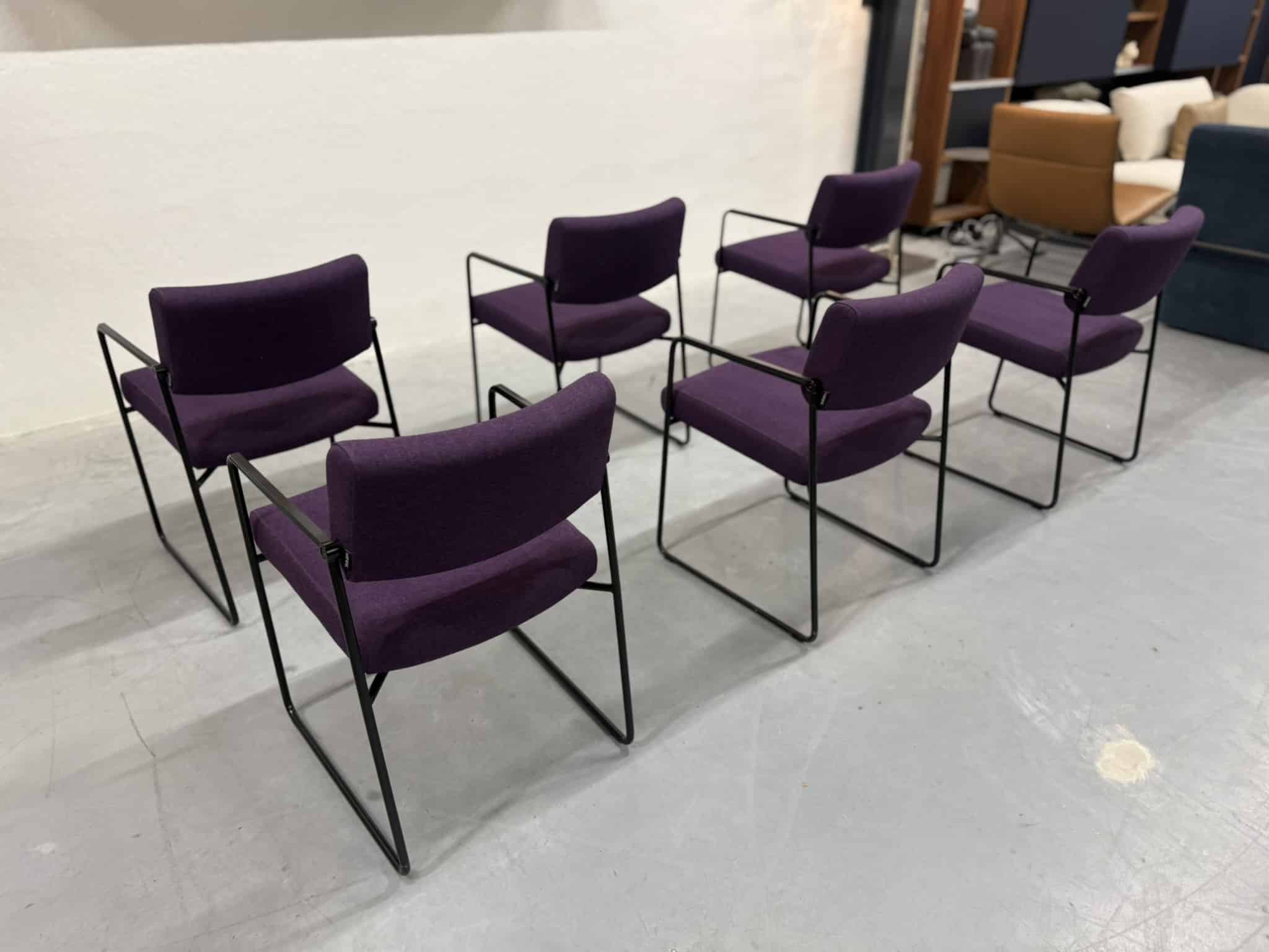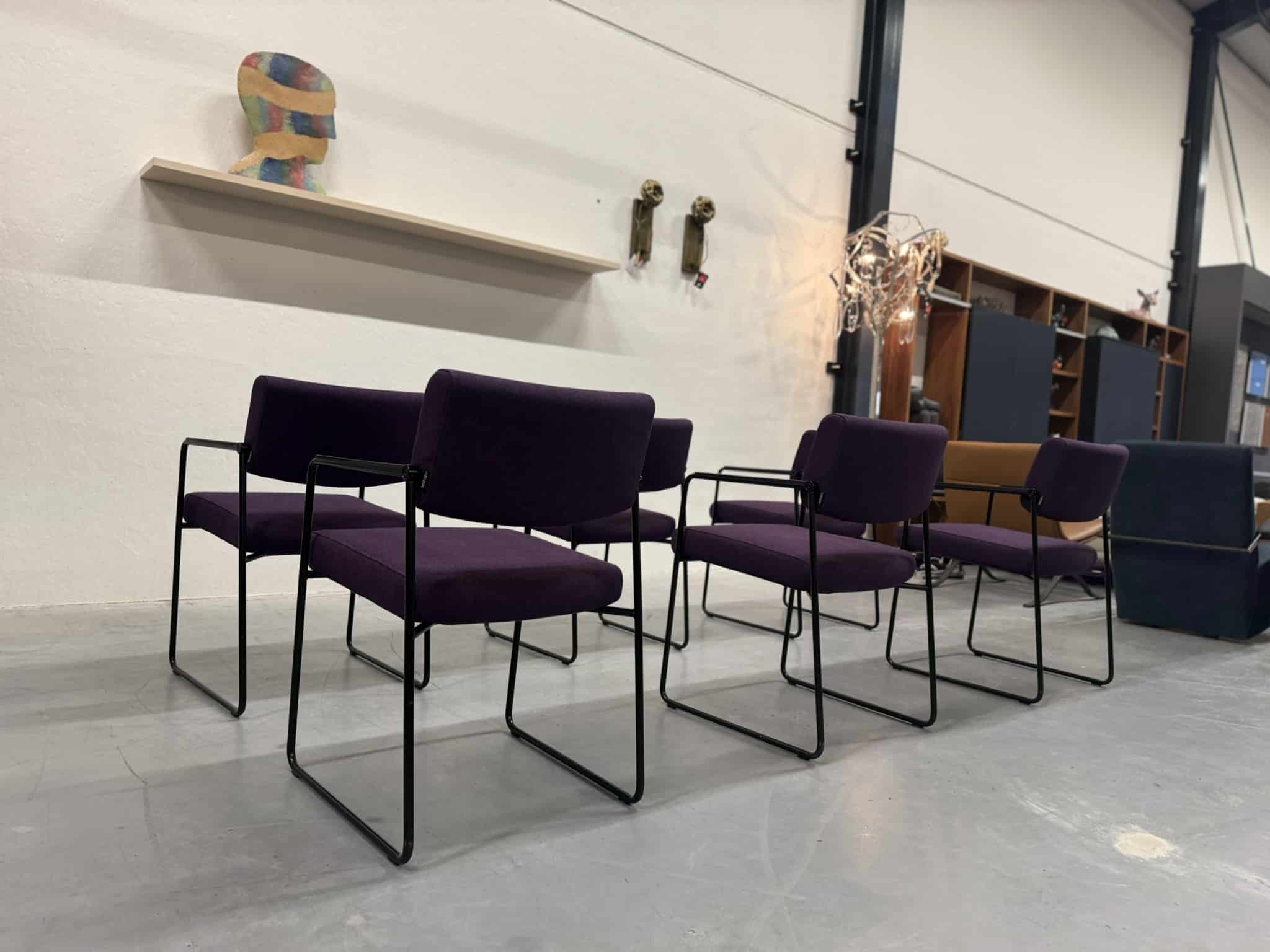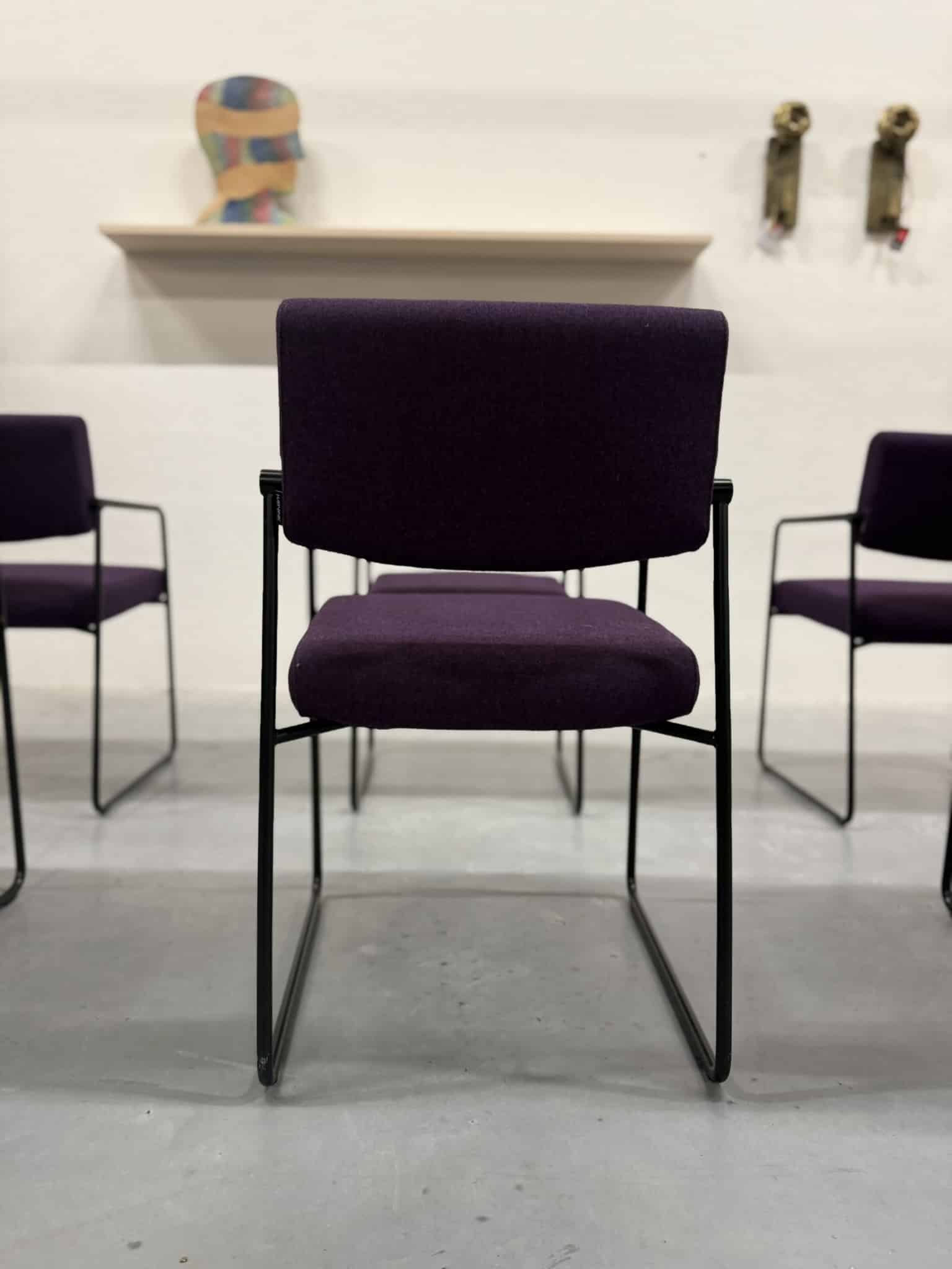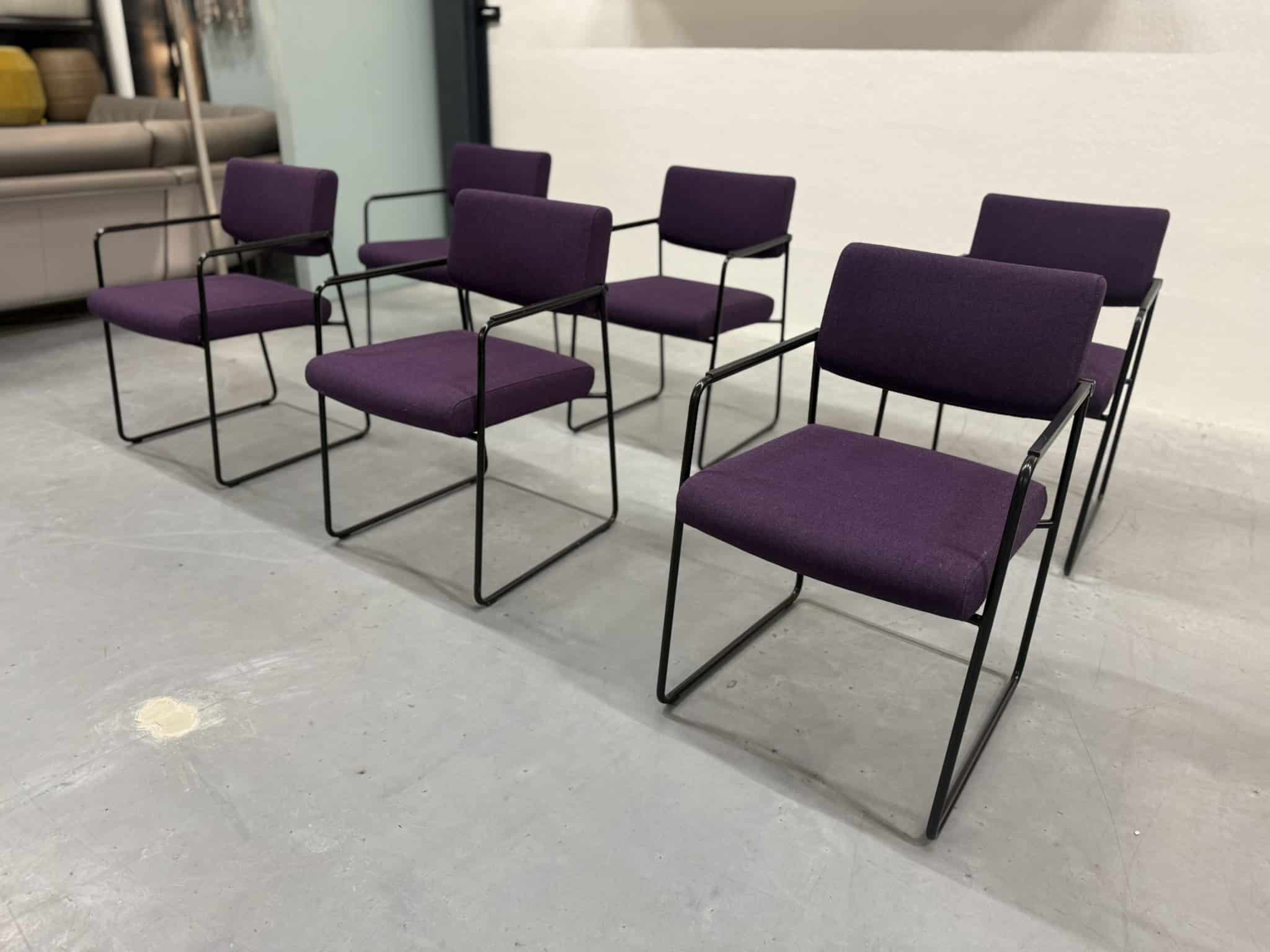 Een set van zes Harvink Duck eetkamerstoelen, uitgevoerd in een rijke paarse wolstof met een elegant zwart metalen onderstel. Deze stoelen combineren verfijnde vormgeving met het zitcomfort waar Harvink al decennialang om bekendstaat.