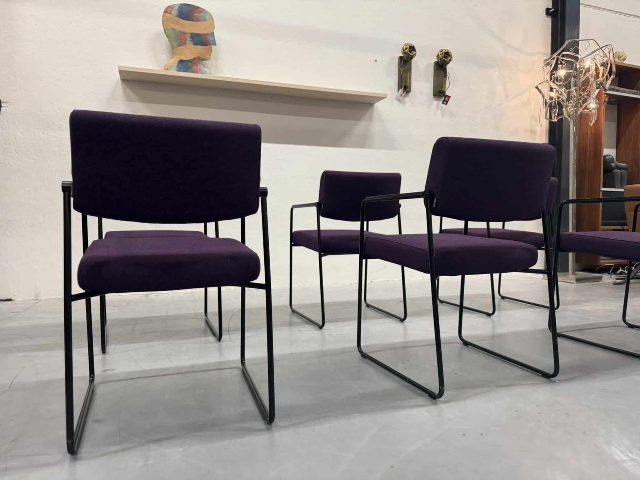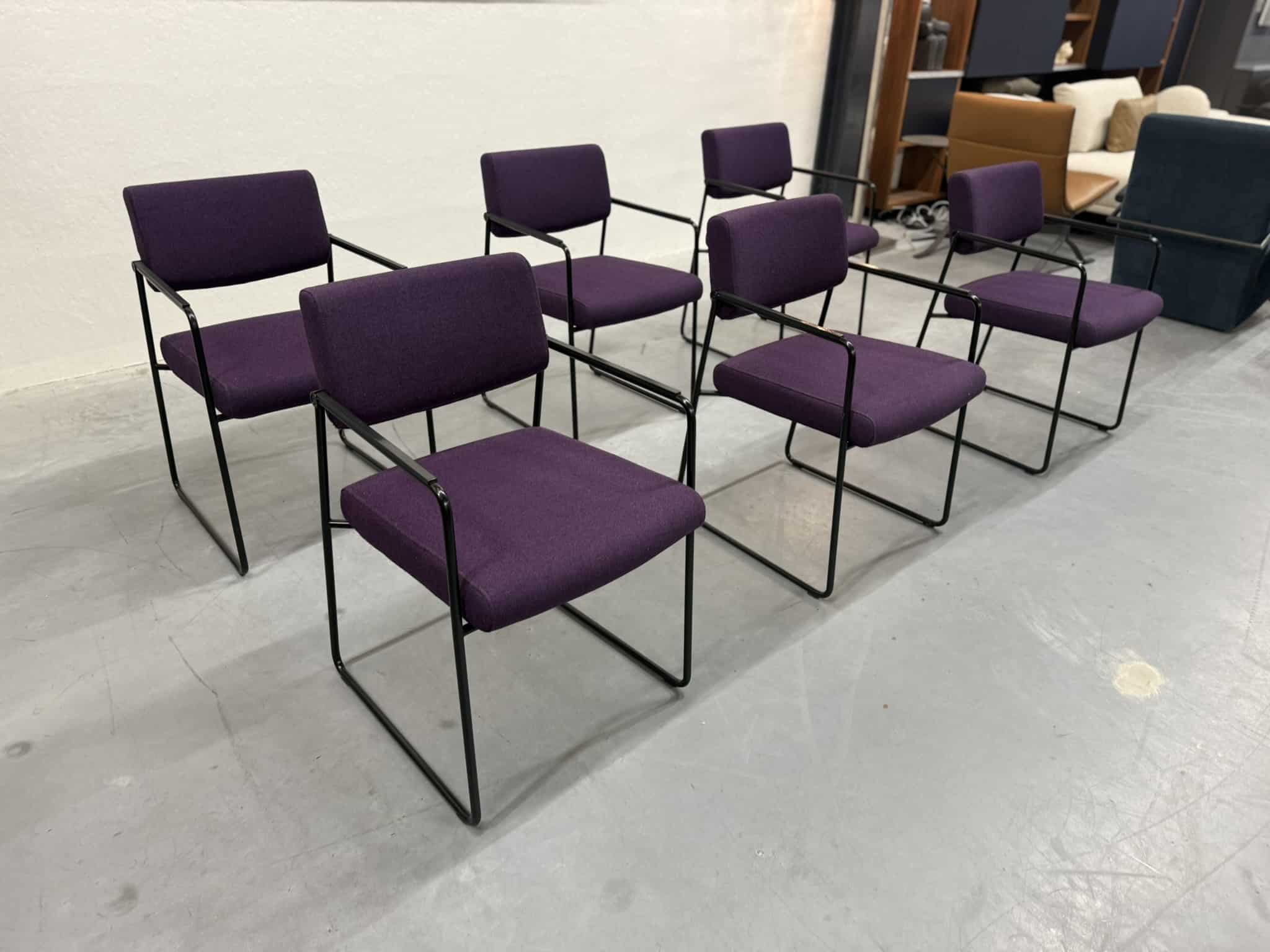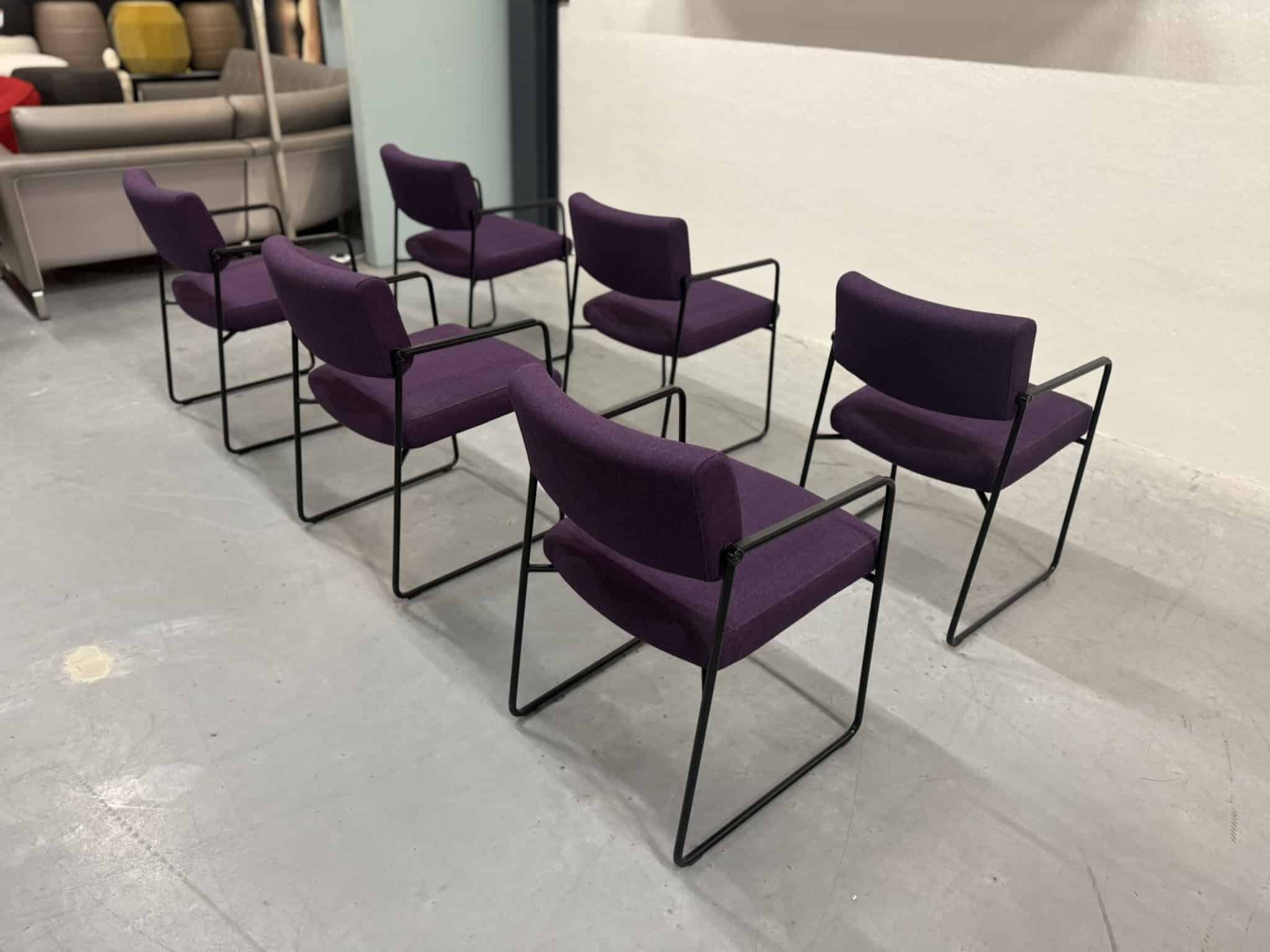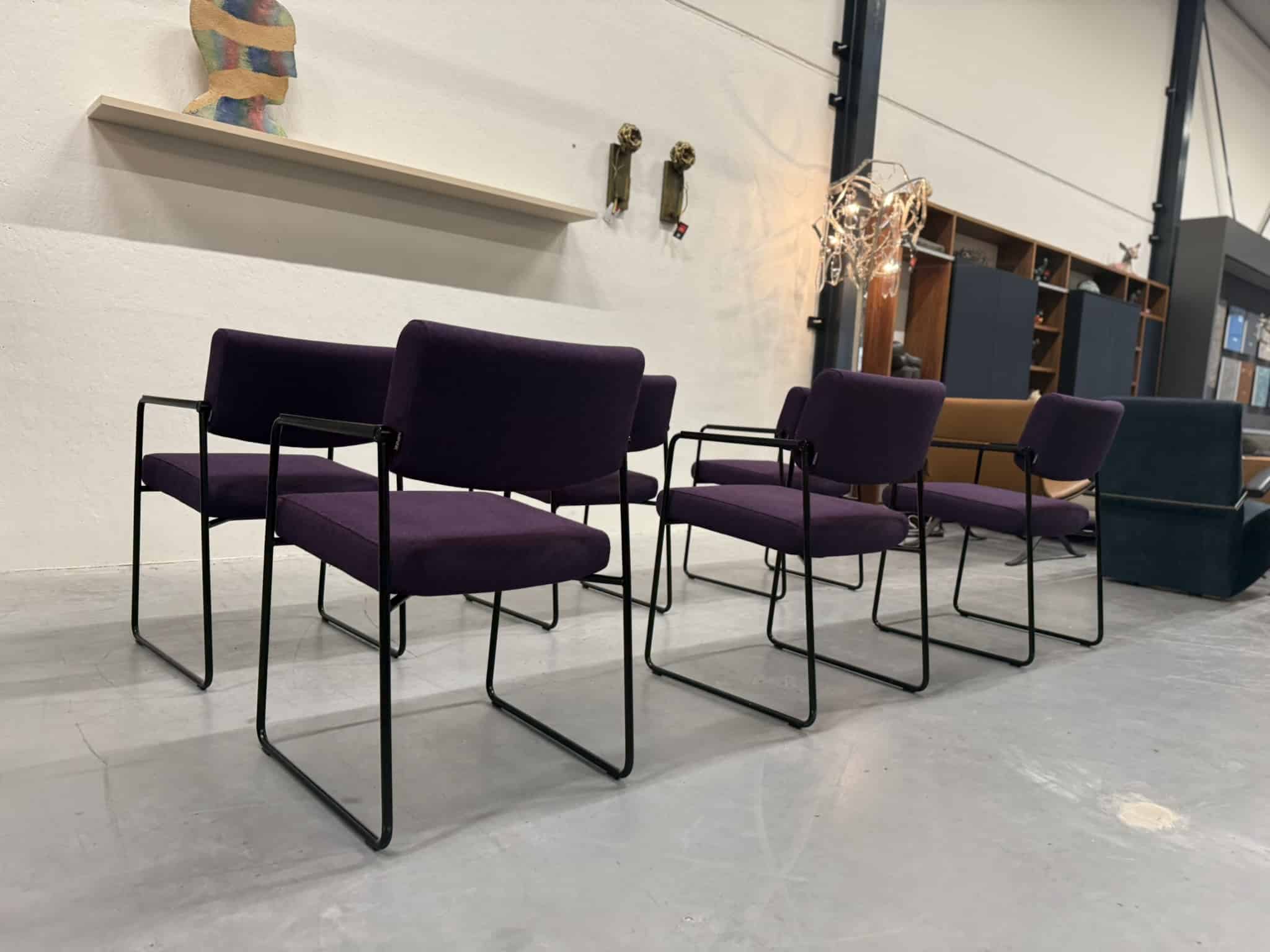 Een set van zes Harvink Duck eetkamerstoelen, uitgevoerd in een rijke paarse wolstof met een elegant zwart metalen onderstel. Deze stoelen combineren verfijnde vormgeving met het zitcomfort waar Harvink al decennialang om bekendstaat.
