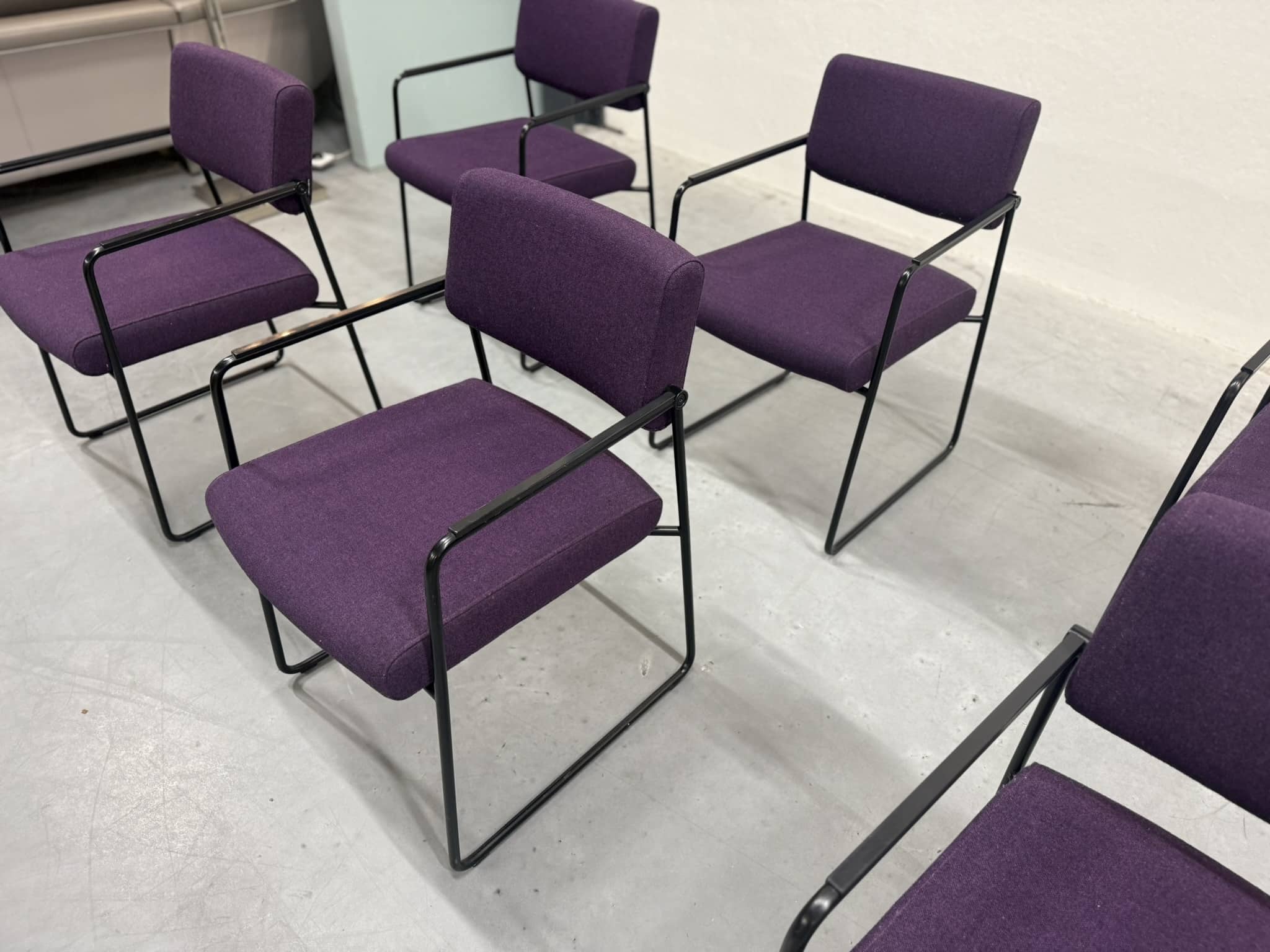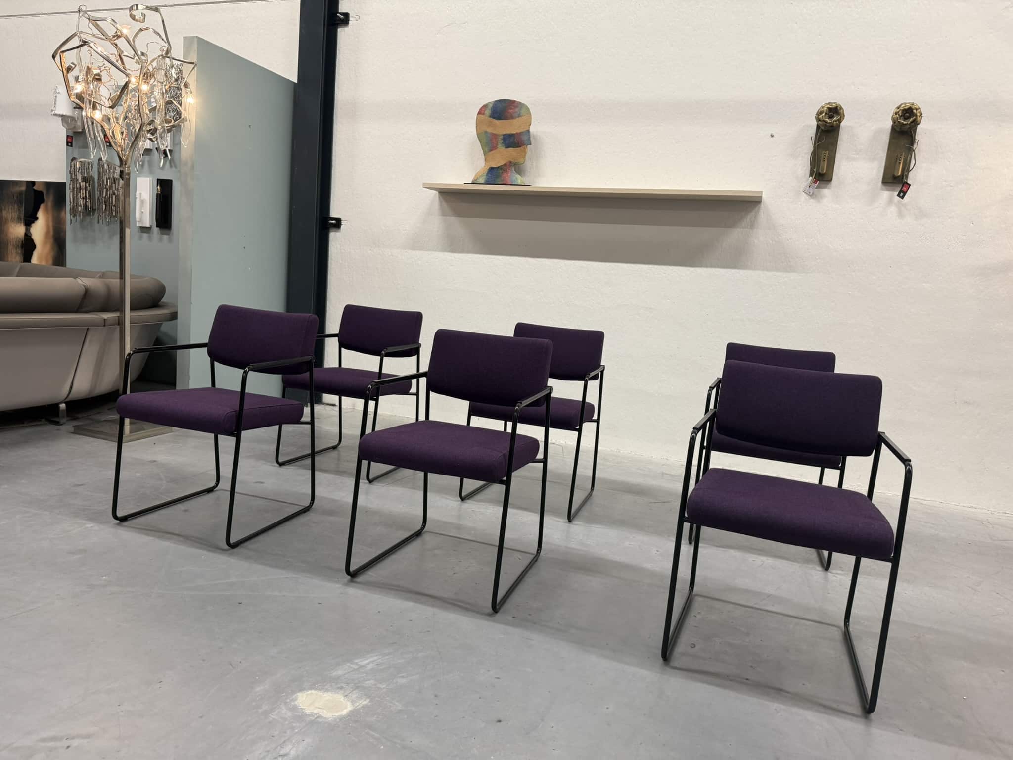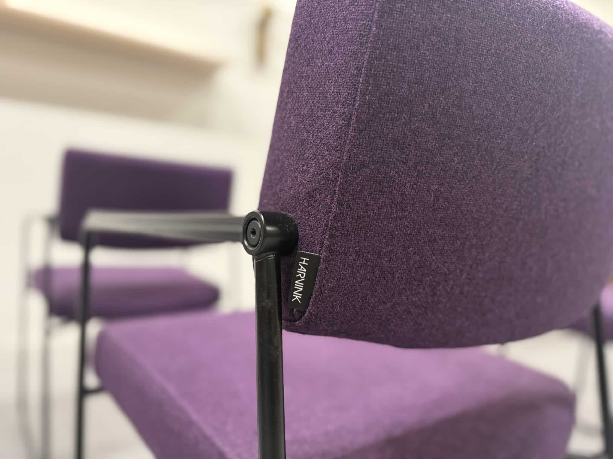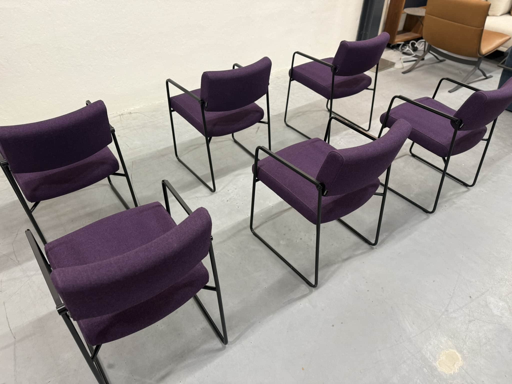 Een set van zes Harvink Duck eetkamerstoelen, uitgevoerd in een rijke paarse wolstof met een elegant zwart metalen onderstel. Deze stoelen combineren verfijnde vormgeving met het zitcomfort waar Harvink al decennialang om bekendstaat.