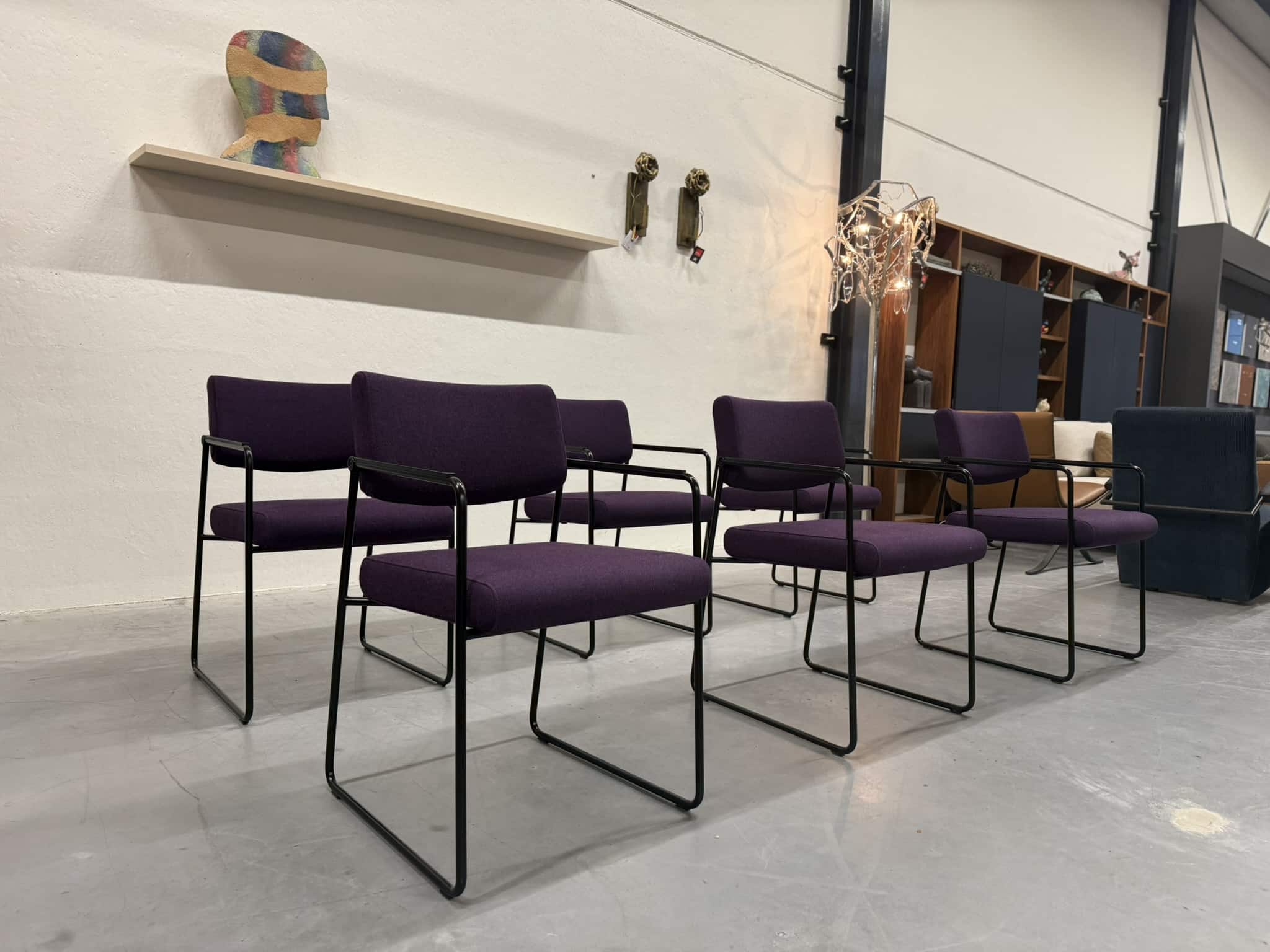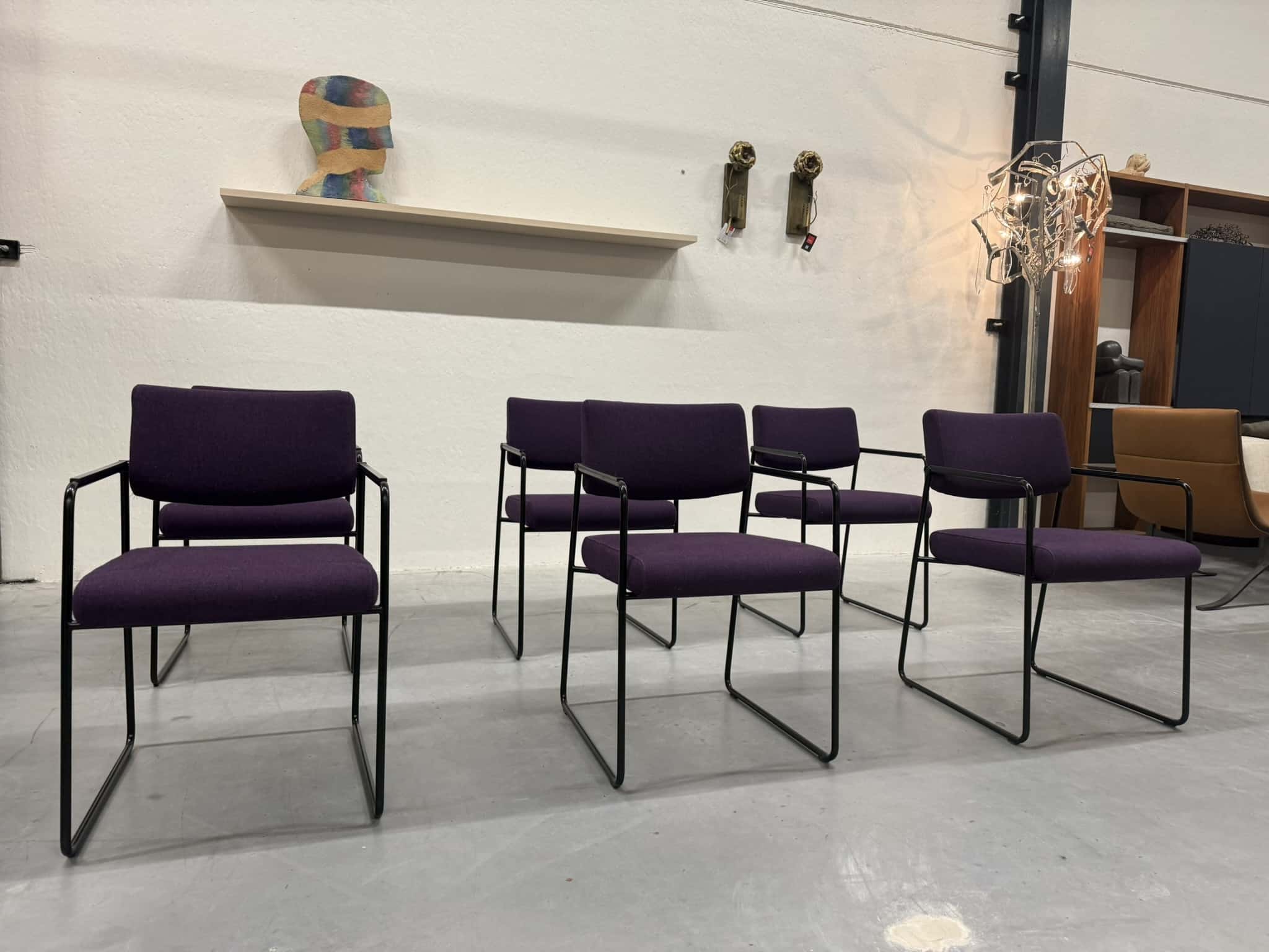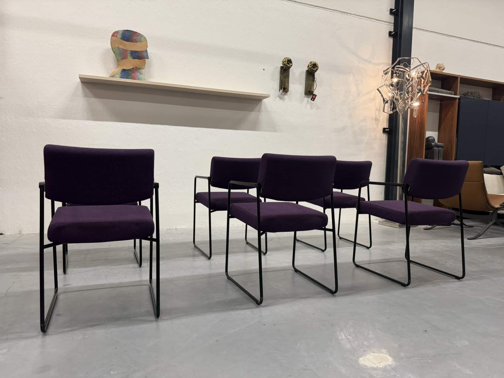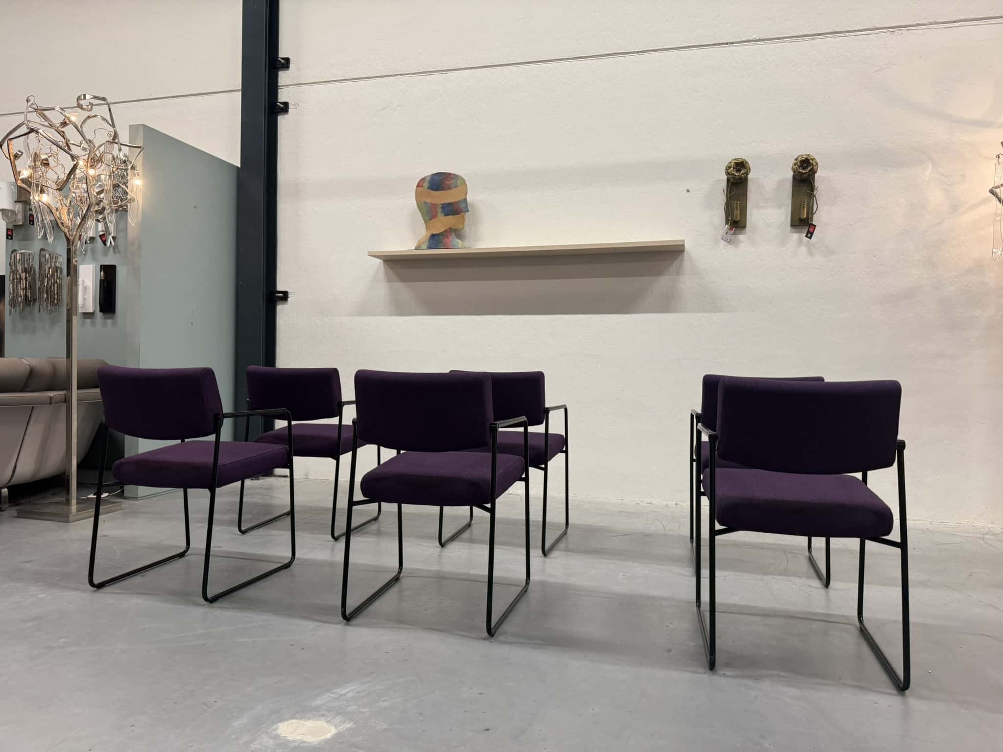 Een set van zes Harvink Duck eetkamerstoelen, uitgevoerd in een rijke paarse wolstof met een elegant zwart metalen onderstel. Deze stoelen combineren verfijnde vormgeving met het zitcomfort waar Harvink al decennialang om bekendstaat.