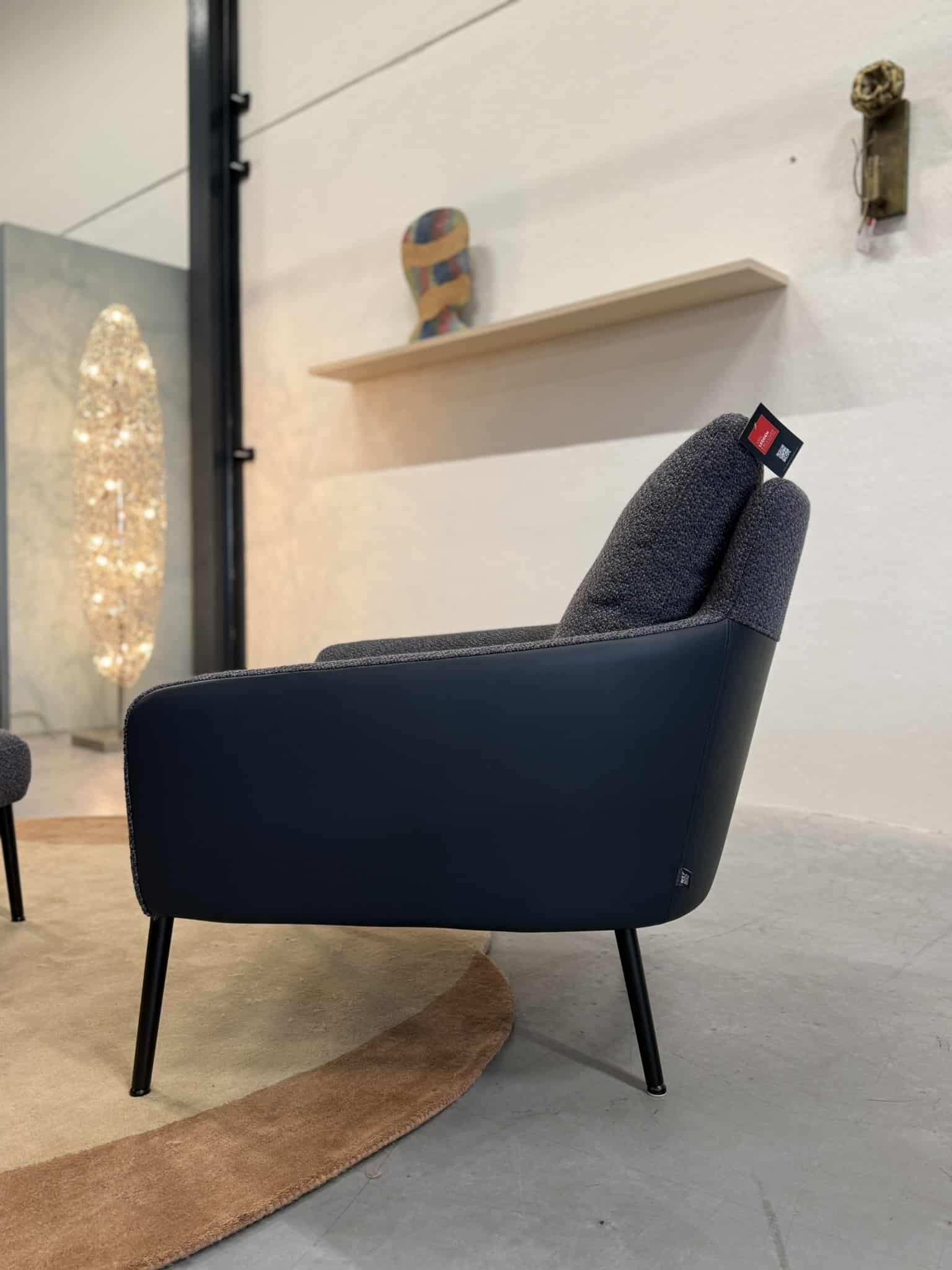 De Rolf Benz Jon 561 fauteuil met hocker, uitgevoerd in Duo bekleding met blauw leder en een zwart onderstel, combineert een elegant ontwerp met een hoogwaardig zitcomfort. De verfijnde vormgeving en het subtiele lijnenspel geven de fauteuil een moderne en uitgebalanceerde uitstraling, terwijl de combinatie van materialen zorgt voor een rijke en luxe afwerking.