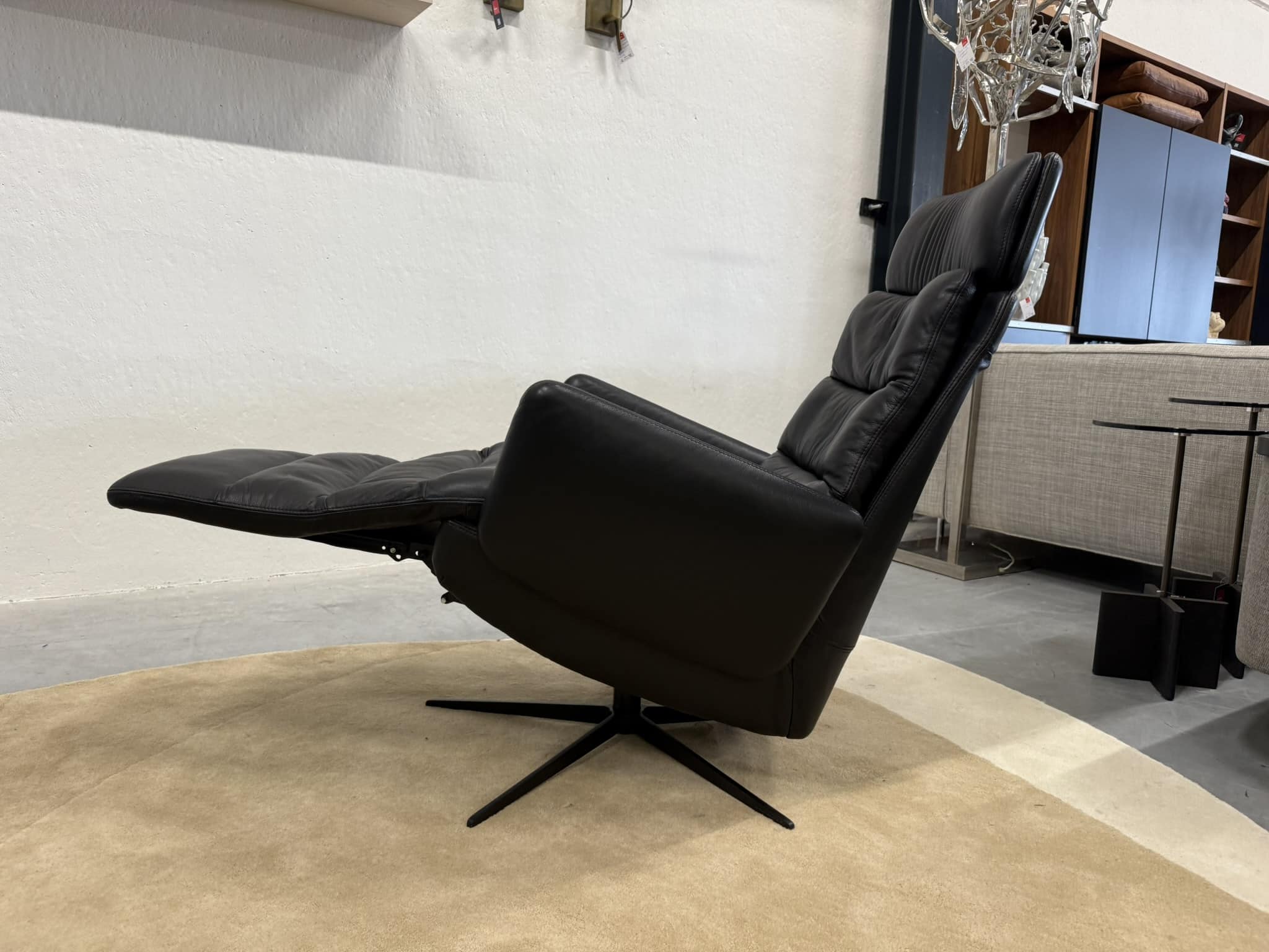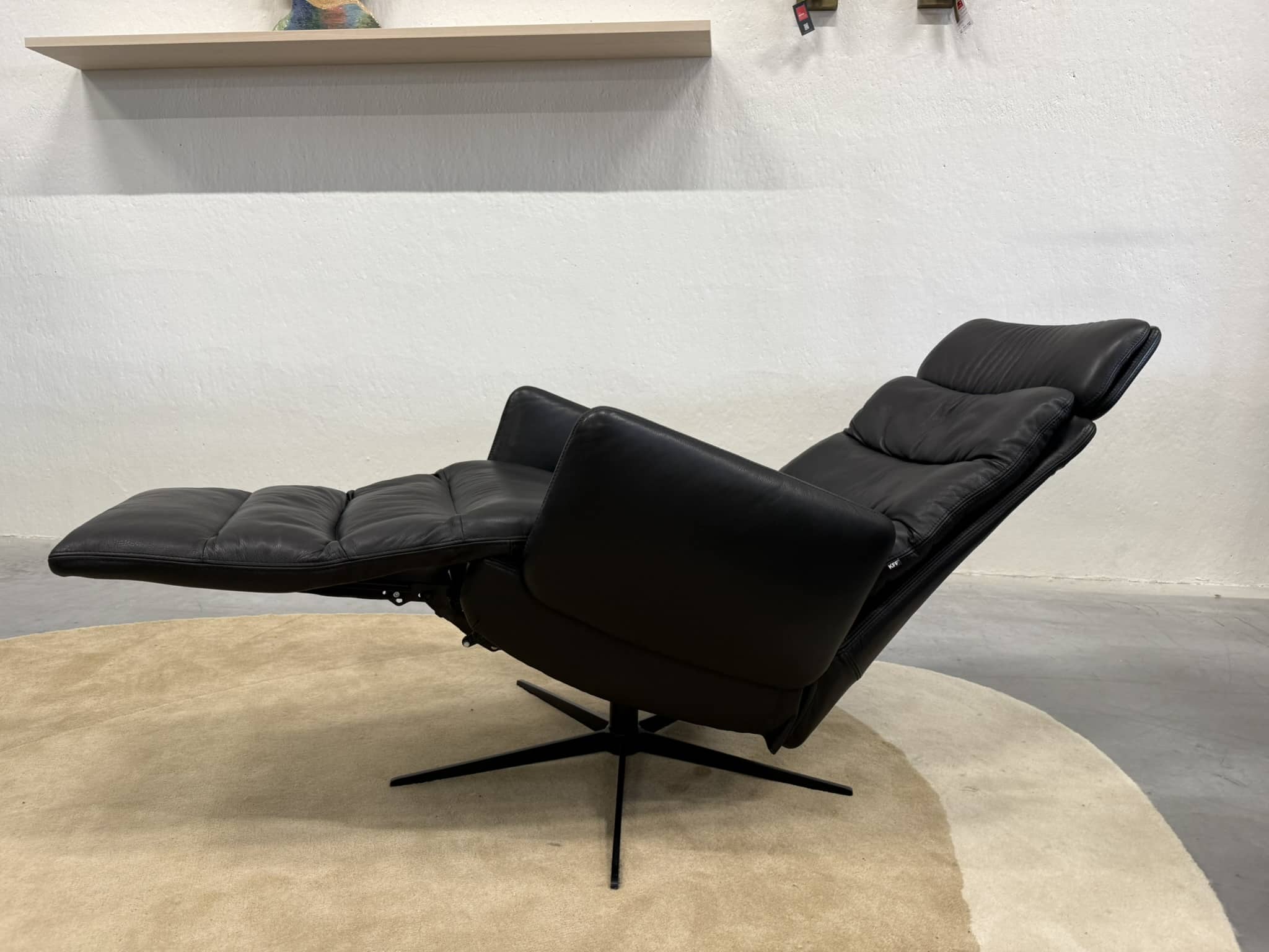 Nieuw kff arva e-lounge elektrisch verstelbare relaxfauteuil uitgevoerd in 4 leer sauvage 8105 zwart & zwart onderstel. Nieuwprijs €4.679,- Afm 70xd86-169xh108-112
