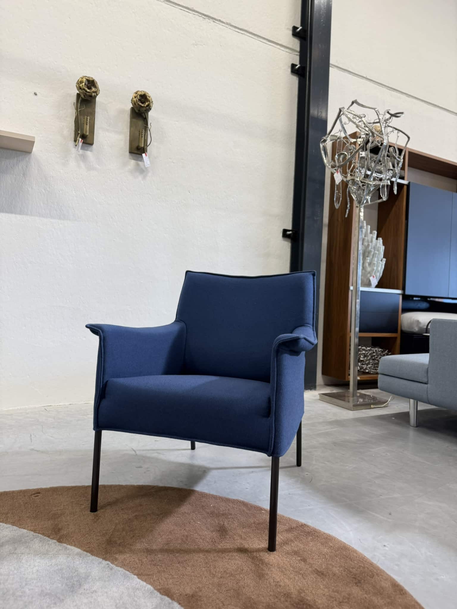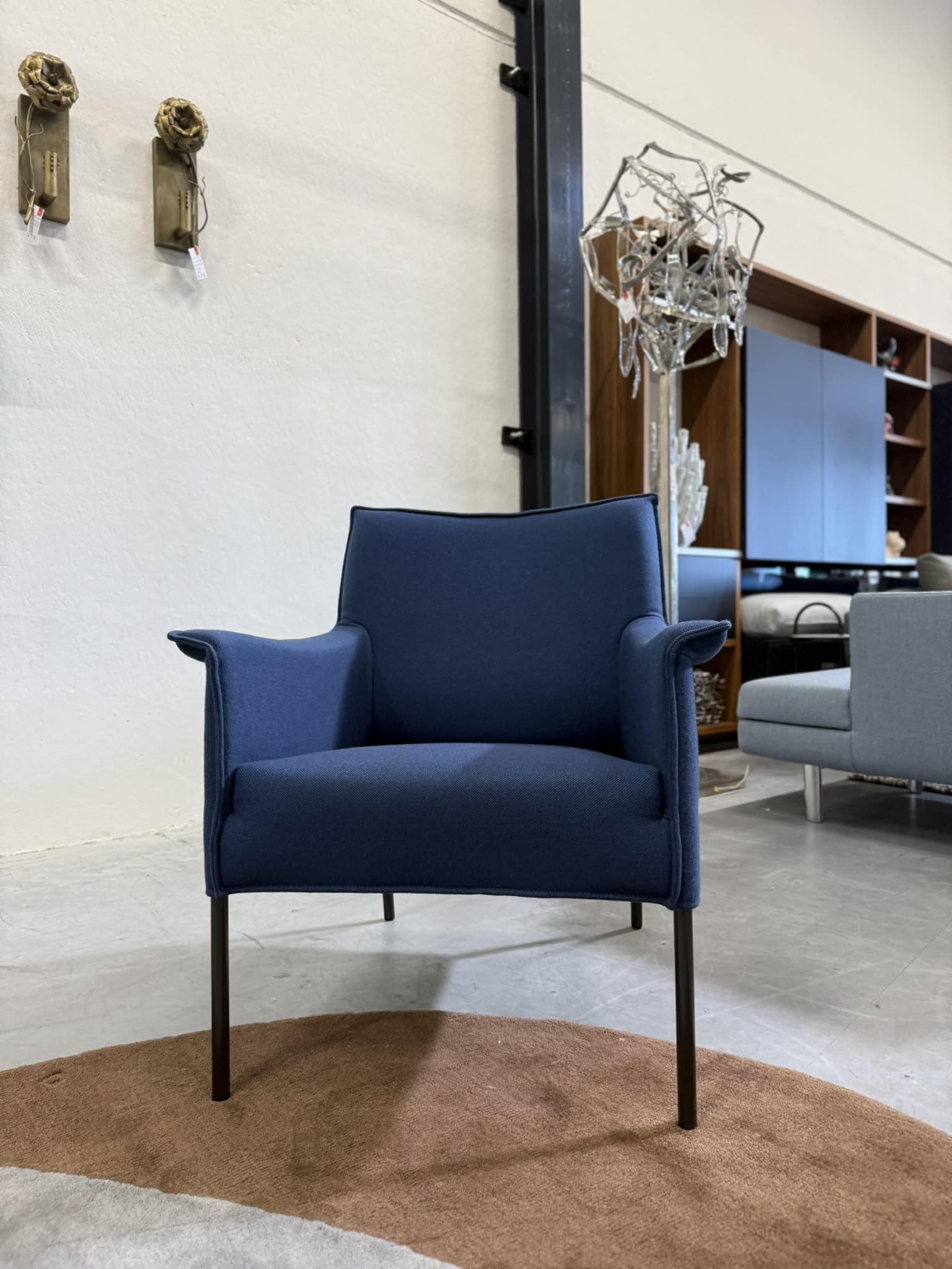 Design on stock limec fauteuil uitgevoerd in ploegwool in de kleur blauw. Afm l73x72xh84 zh45 zd52cm nieuwprijs €1579