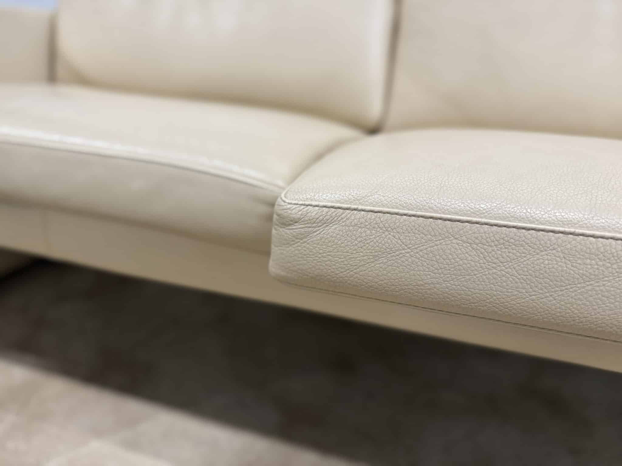 Leolux Timandra 2.5-zits bank uitgevoerd in Senso leder in de kleur Sahel. Zitdiepte is naar wens aan te passen.